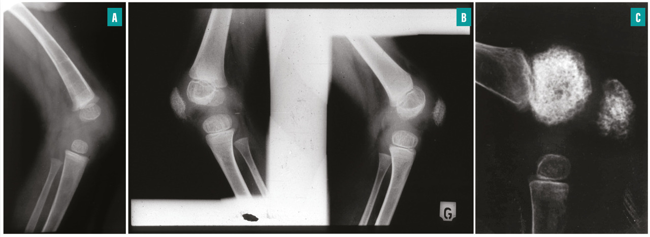 Radiographie osseuse du genou chez un enfant atteint de CINCA souffrant d’une arthropathie hypertrophiante précoce : respectivement à 6 mois (A), 2 ans (B) et 3,5 ans (C). On observe une irrégularité des métaphyses et épiphyses, une hypertrophie irrégulière progressive avec un aspect « en mie de pain » des épiphyses et de la rotule.