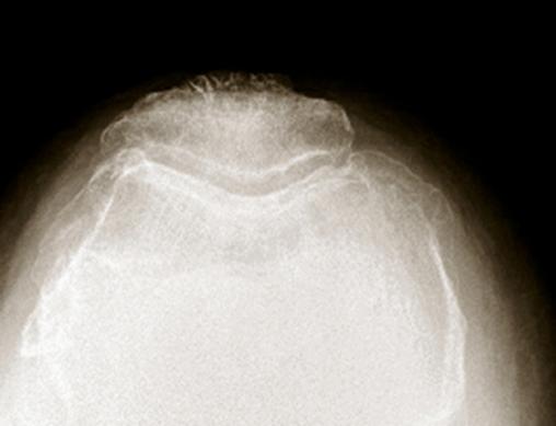 Radiologie d'une arthrose fémoro-patellaire. Sur les incidences axiales, on retrouve un amincissement ou une disparition de l’interligne externe, associés à une ostéophytose rotulienne trochléenne externe