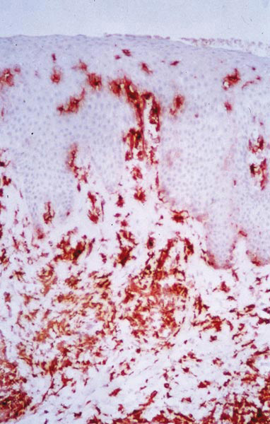 Les cellules rouges dans le derme superficiel et dans l’épiderme sont des lymphocytes T (immunomarquage par anticorps monoclonal anti-CD3). Les lymphocytes T jouent un rôle capital dans le déclenchement et le maintien de l’inflammation au cours du psoriasis. 3 Dans le derme, on retrouve une infiltration de lymphocytes T, principalement CD4+, de type mémoire, CD45 RO+, et de cellules mononucléées, associés plus tardivement à des polynucléaires neutrophiles.