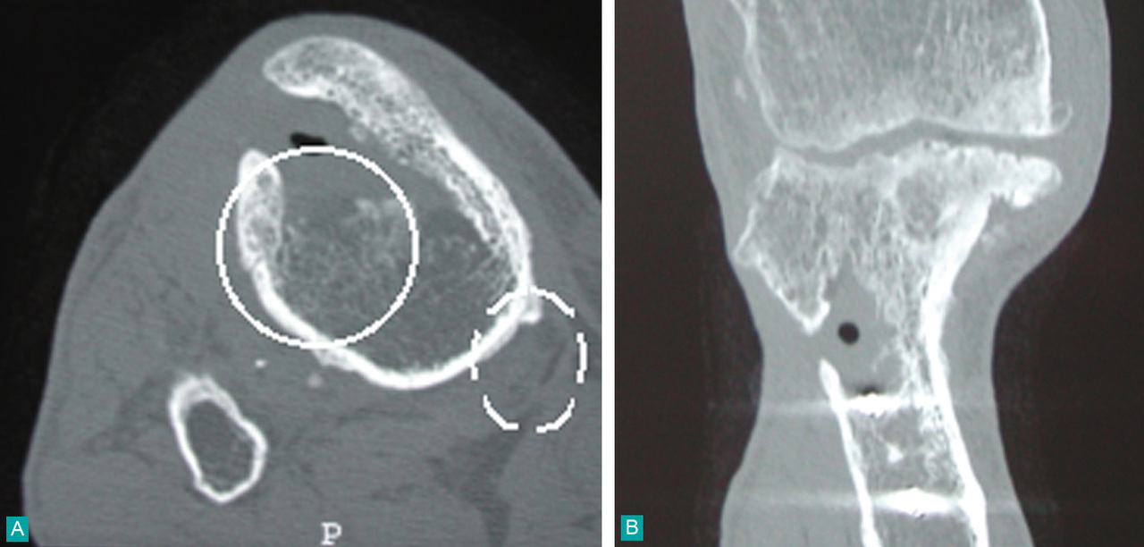 A. Cercle plein : cavité avec en son sein la présence d'une bulle d'air signant l'infection ; cercle en pointillés : appositions périostées.B. Reconstruction frontale : noter la communication de la vis proximale avec la cavité d'ostéite.