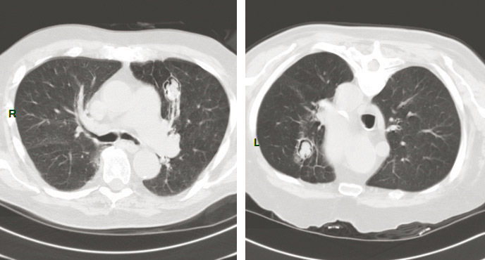 © Sylvain Poirée - La Revue du Praticien Aspergillome pulmonaire en décubitus et procubitus montrant la déclivité de la boule fungique.