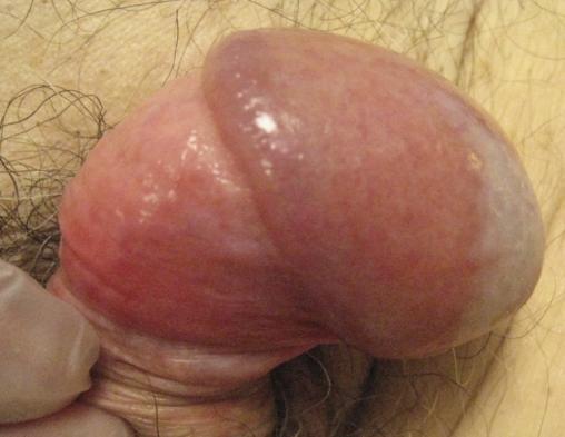 La balanite est volontiers associée à une inflammation du sillon balano-préputial et de la face interne du prépuce, réalisant comme sur cette image une balanoposthite
