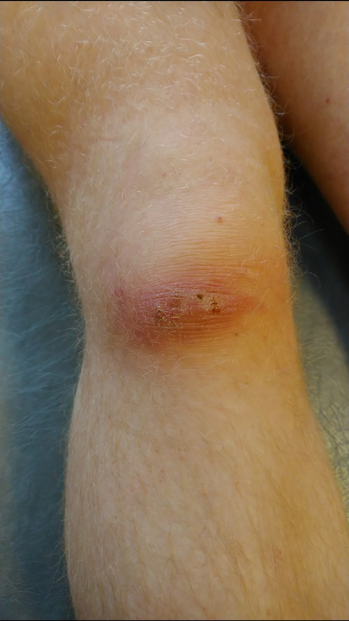 À l’examen clinique, l’articulation est douloureuse de manière diffuse, oedématiée, érythémateuse et chaude. C'est une bursite, infection provoquée par une contamination bactérienne de la bourse due à un traumatisme du genou (contamination par la plaie cutanée). Les germes en cause sont le plus souvent le staphylocoque doré ou un streptocoque.