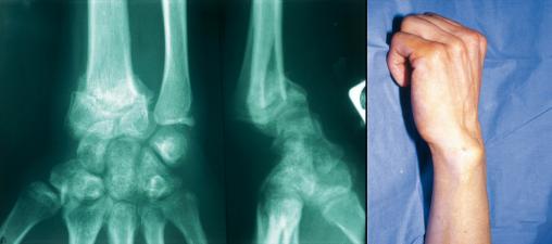 Cal vicieux de face et de profil. Noter l’angulation et le raccourcissement majeurs du radius. Les consolidations en position vicieuse de l’extrémité inférieure du radius [cals vicieux articulaires et (ou) extra-articulaires] ont des conséquences fonctionnelles parfois très invalidantes sur les mouvements du poignet, mais très souvent aussi sur la pronosupination des 2 os de l’avant-bras.