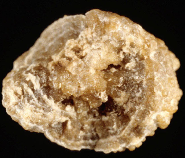 Section d’un calcul de type Ic chez un patient présentant une hyperoxalurie primaire. Noter la couleur claire, la structure relativement lâche et l’absence d’organisation cristalline, tous ces critères évoquant une cristallisation rapide par hyperoxalurie majeure. Dimensions: 8 x 7 mm.