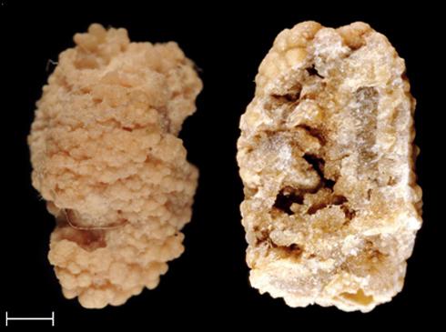 Calcul lié à une hyperoxalurie primitive de type 1 par déficit hépatique en alanine glyoxylate aminotransférase (AGT). Noter la couleur très claire de ces calculs dont la croissance rapide, en raison de l'hyperoxalurie massive, ne permet pas une incorporation importante de pigments urinaires. La section est lâche au centre et très peu structurée, témoignant de la cristallisation et de l'agrégation rapides des cristaux. Il faut se souvenir que plus de 99 % des calculs liés à ces pathologies génétiques graves présentent ce type de morphologie qui oriente le diagnostic, alors que la composition (whewellite) est banale.Barre = 2 mm.