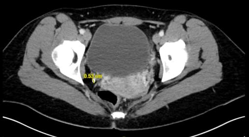 Théo Arber, La Revue du Praticien Scanner abdominopelvien non injecté. On y distingue un calcul pelvien droit de 0,53 cm.