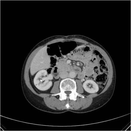 Tomodensitométrie avec injection au temps mixte néphrographique et excrétoire. Visibilité du calcul par transparence au niveau des cavités rénales droites. Opacification mixte du parenchyme rénal et des cavités rénales.