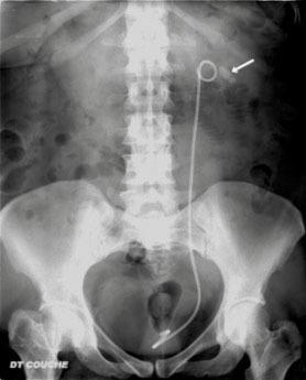 ASP couché de face montrant un calcul rénal et une sonde double J. Attention car 10 % des calculs sont radio-transparents, les calculs millimétriques peuvent également ne pas être mis en évidence par un ASP et des calculs peuvent être masqués par la trame osseuse ou l'aéroiléie. Inversement, des éléments non lithiasiques calcifiés se projetant sur les voies urinaires peuvent simuler une lithiase.