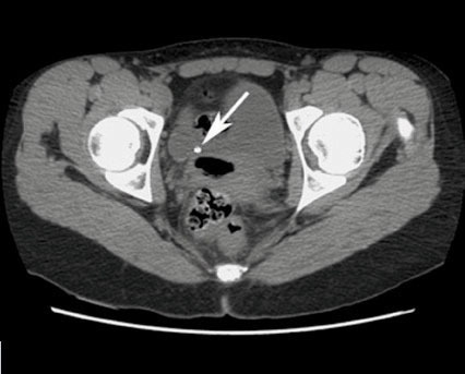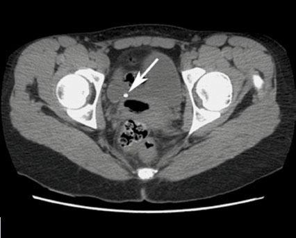 Vladimir Gomola, Jacques Hubert (La Revue du Praticien) Tomodensitométrie non injectée en coupe axiale montrant une lithiase du bas uretère droit au niveau de la jonction vésico-urétérale.