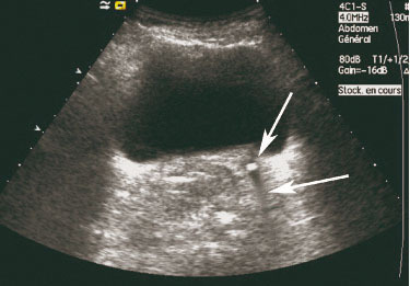 Échographie vésico-rénale. Hyperéchogénicité rétro-vésicale compatible avec une lithiase du bas uretère gauche avec cône d'ombre postérieur. Il s'agit de signes échographiques directs. Les calculs sont facilement visualisés au niveau rénal, de l'uretère proximal sous-pyélique et terminal juxta-vésicale à condition que la vessie soit remplie.