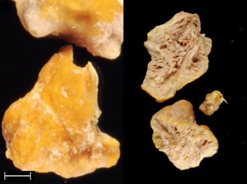 La surface jaunâtre et la section beige clair faite de baguettes enchevêtrées sont caractéristiques de cette espèce cristalline qui conduit à des calculs radio-transparents et très peu visibles, même au scanner.Barre = 1 mm.