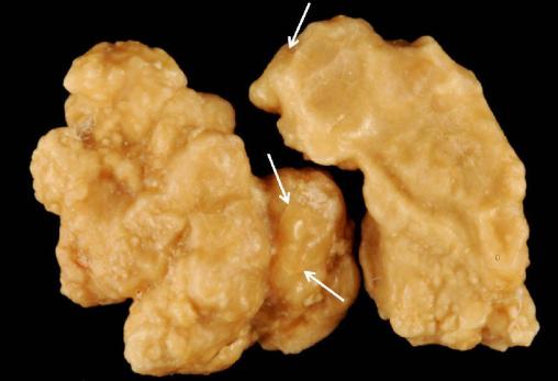 Calculs de carbapatite de type IVa2 chez un enfant de 4 ans ayant une acidose tubulaire distale d’origine génétique avec surdité. Noter l’aspect brillant, vernissé, de la surface du calcul et la présence de fines craquelures caractéristiques (flèches). Dimensions : 6 x 4 et 5,5 x 3 mm.