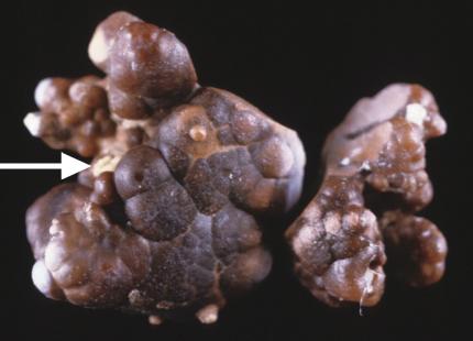 Calculs liés à une hyperoxalurie diététique et nucléés sur une plaque de Randall de carbapatite (petit dépôt blanc superficiel : flèche).Dimension comprise entre 4 et 6 mm.