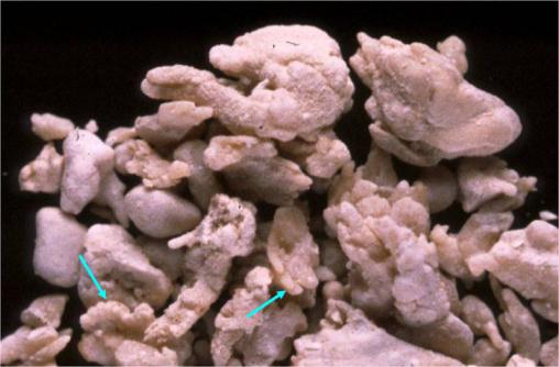 Calculs multiples de whewellite de type Ic avec des zones d’aspect bourgeonnant (flèches). Noter la couleur très claire de ces calculs. Cette couleur claire et ce type de structure évoquent des calculs jeunes à croissance rapide. La morphologie de type Ic doit faire évoquer en premier lieu une hyperoxalurie primaire de type 1, par déficit hépatique en alanine glyoxylate aminotransférase. Dimensions : 1 x 0,5 à 7 x 4 mm.