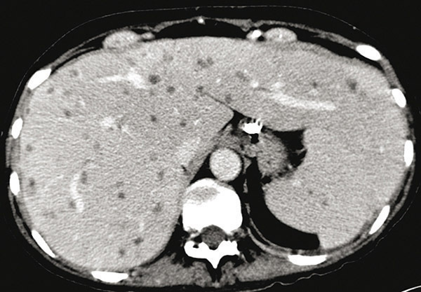 © Sylvain Poirée - La Revue du Praticien Tomodensitométrie abdominale après injection de produit de contraste montrant de multiples nodules hépatiques et spléniques.