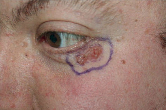 Le carcinome basocellulaire superficiel est une plaque érythémato-squameuse, bordée de perles parfois non visibles à l’œil nu, s’étendant progressivement.