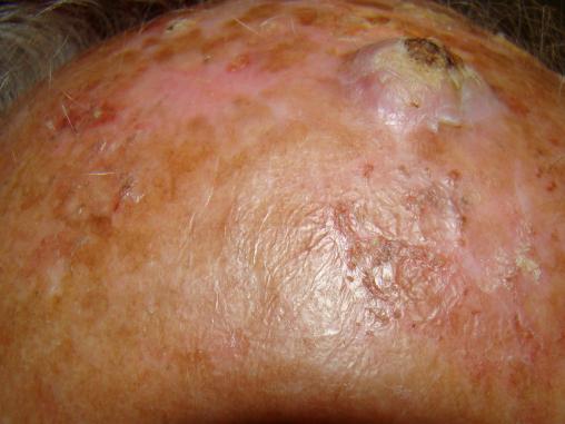 Collection Pierre Francès Multiples lésions croûteuses de couleur jaune et nodule dont le centre est hyperkératosique, avec des bords bourgeonnants.