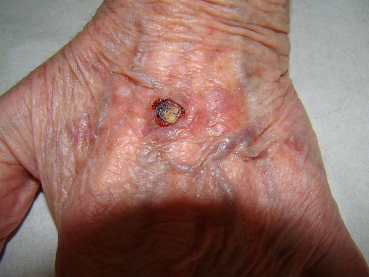 Collection Pierre Francès Lésion située au niveau du dos de la main gauche. Cette dernière est apparue il y a 1 an sous la forme d’une « corne ». Récemment, elle est devenue ulcérée en périphérie et végétante au centre.