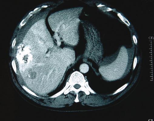 Tumeur hypervasculaire sous-capsulaire associée à un hémopéritoine. L'artériographie montre la lésion et objective l'hémorragie. Elle permet, de plus, de faire un premier traitement (embolisation artérielle au mieux sélective).