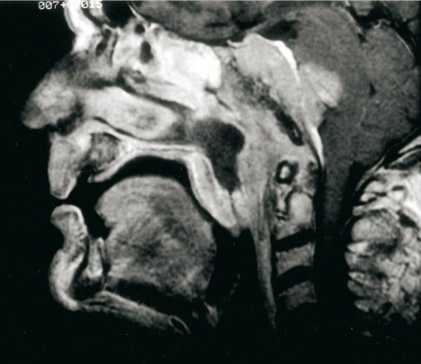 IRM incidence sagittale du nasopharynx. Carcinome indifférencié du nasopharynx étendu au sphénoïde et en intracrânien.