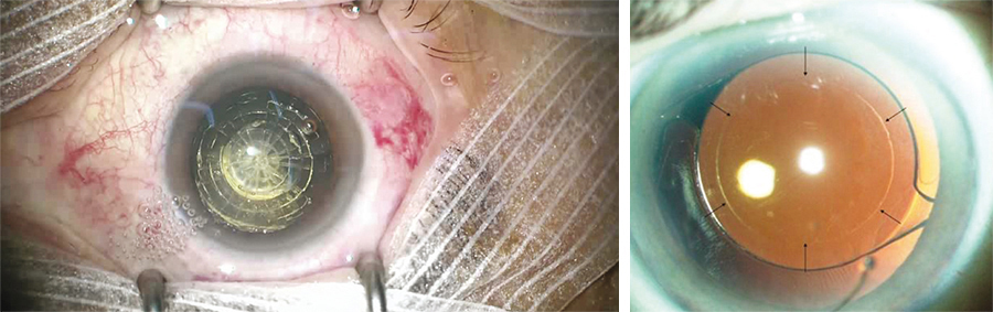 A. Aspect immédiat après découpe cristallinienne au laser femtoseconde. La chirurgie conventionnelle permet ensuite l'extraction du cristallin ainsi préparé.B. La régularité et la reproductibilité de la découpe cristallinienne sont augmentées par l'utilisation du laser femtoseconde, qui trouve toute sa place lors d'une chirurgie à visée réfractive. Implant torique bien centré grâce à la régularité de la découpe du rhexis.