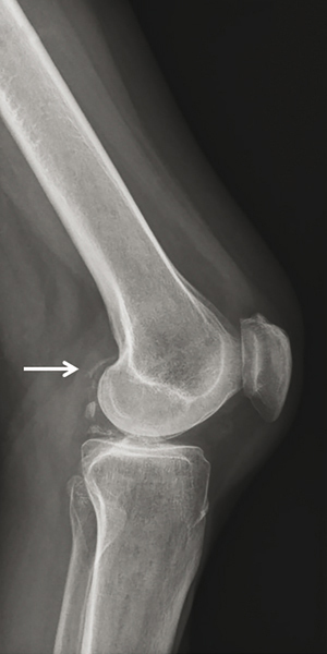 © Gérard Chalès, Pascal Guggenbuhl (La Revue du Praticien) Radiographie de genou de profil. Liseré de chondrocalcinose bordant le cartilage. Tiré de : Guggenbuhl P, Coiffier G, Albert JD, Chalès G. Dossier. Arthropathies microcristallines. Rev Prat 2015;65(5):665-82.