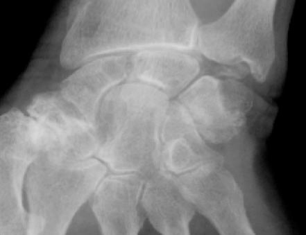 © La Revue du Praticien Radiographie de poignet gauche de face. Chondrocalcinose articulaire. Pincement de l'interligne radiocarpien. Pincement de l'interligne scaphotrapézien. Incrustation calcique du ligament triangulaire du carpe.