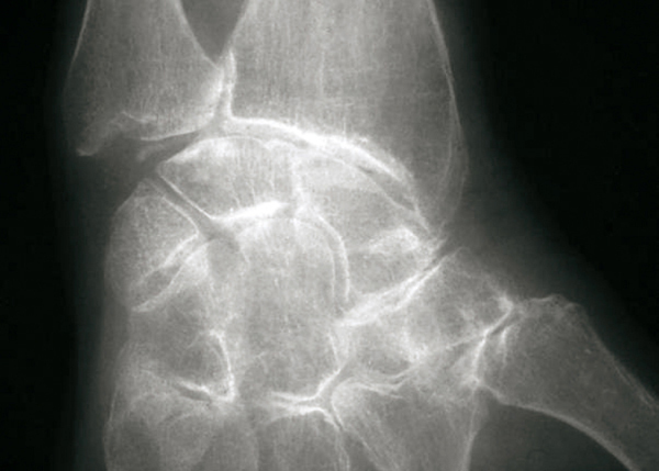 © Gérard Chalès, Pascal Guggenbuhl (La Revue du Praticien) Radiographie du poignet de face. Chondrocalcinose articulaire : calcification du ligament triangulaire du carpe. Extrait de : Chalès G, Guggenbuhl P. Arthropathie microcristalline. Rev Prat 2013;63(5):709-20.