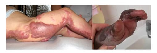 Cicatrices hypertrophiques inesthétiques et responsables de rétraction cutanée et articulaire. Extrait de : Douleur dans la rééducation des brûlures de l’enfant