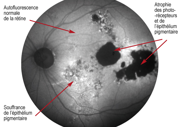 Les photorécepteurs qui contiennent des pigments visuels et l'épithélium pigmentaire qui les dégrade sont autofluorescents en lumière bleue. Les vaisseaux et la papille du nerf optique qui ne contiennent pas de pigment sont noirs. Ici, dans une maladie diffuse de l'épithélium pigmentaire, des taches noires d'atrophie côtoient des zones d'hyper-autofluorescence de souffrance de l'épithélium pigmentaire.