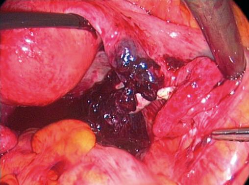 Cœlioscopie : grossesse extra-utérine droite rompue avec hémopéritoine dans le cul-de-sac de Douglas.