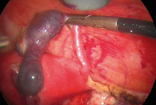 Après coagulation du mésosalpinx et section aux ciseaux, la trompe contenant la grossesse extra-utérine ne tient plus que par la corne utérine.