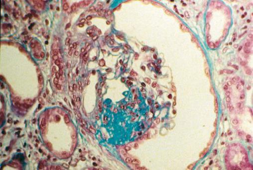 Dans de rares cas de lésions de hyalinose segmentaire et focale, la totalité du floculus est intéressée. Le floculus se rétracte alors sur son pôle vasculaire réalisant un « collapsing glomerulopathy » observée principalement chez les noirs infectés par le VIH.