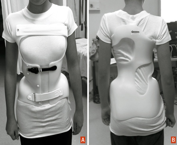 Vue de face (A) et de dos (B) d’une jeune patiente porteuse d’un corset orthopédique dans le cadre du traitement d’une scoliose évolutive.
