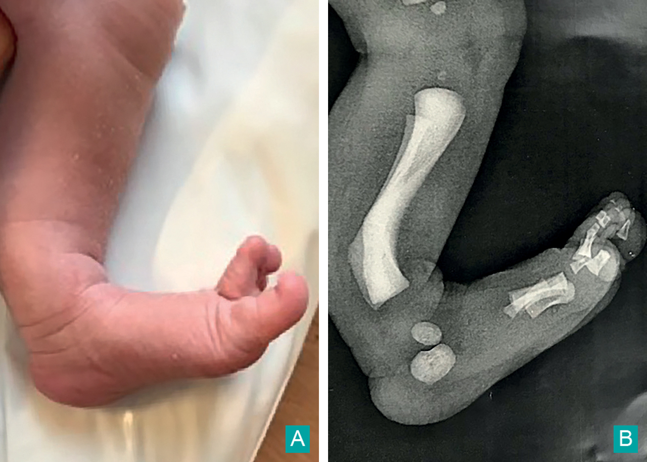 La courbure à concavité antéro-externe touche le tibia et le péroné dans le tiers inférieur des diaphyses (A). Le pied est en calcanéus valgus et se situe dans la concavité de la courbure. Elle est située en dessous d’un genou complet. La radiographie (B) permet d’affirmer que la déformation atteint les deux os de jambe et d’éliminer toute autre anomalie de la trame osseuse. Le pied est strictement normal au plan osseux. Les corticales (peu visibles ici) apparaissent discrètement épaissies.