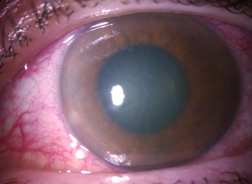 Il s'agit d'une hypertonie aiguë, on note la semi-mydriase (aréflexique), l’œdème de cornée, l’inflammation (douloureuse) globale de l’œil.