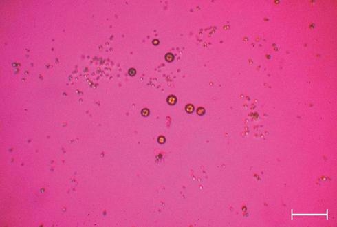 Cristaux de 2,8-dihydroxyadénine témoignant d'un déficit homozygote en adénine phosphoribosyltransférase, une anomalie de la voie des purines transmise sur le mode autosomique récessif et conduisant à une lithiase et/ou une néphropathie cristalline responsable d'insuffisance rénale terminale. L'aspect particulier des cristaux en lumière polarisée, montrant une croix noire et une couronne noire, est évocateur de cette espèce cristalline qui est insoluble, quel que soit le pH de surines.pH = 5,9. Barre = 50 µm.