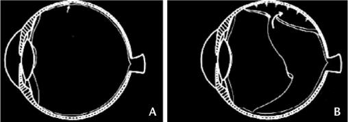 A : traction vitréo-rétinienne périphérique à l’origine d’une déchirure. B : le liquide de la cavité vitréenne passe par la déchirure et soulève la rétine localement.