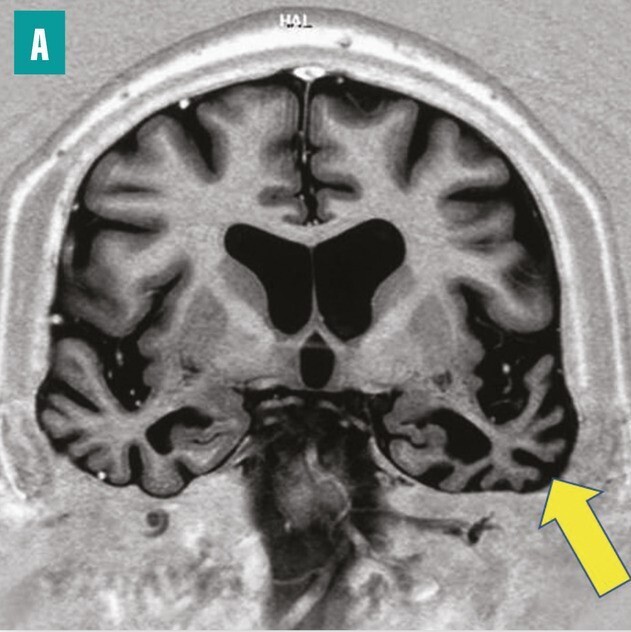 IRM cérébrale en séquence d’inversion-récupération, coupe coronale. Atrophie du cortex temporal prédominant à gauche, dont témoigne l’élargissement des sillons corticaux (flèche)