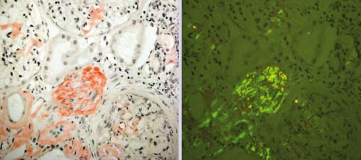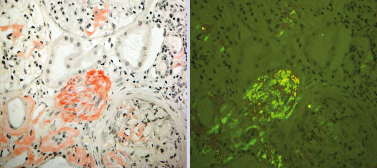 Biopsie rénale : dépôts amyloïdes diffus avec biréfringence jaune-vert en lumière polarisée.