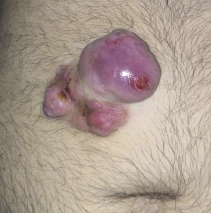 Masse érythémateuse violacée, à surface lisse, ulcérée par endroits, d’environ 7 cm de grand axe et non douloureuse, située au niveau de la région sus-ombilicale. C'est un dermatofibrosarcome de Darier-Ferrand, c'est une tumeur dermique mésenchymateuse de malignité intermédiaire.