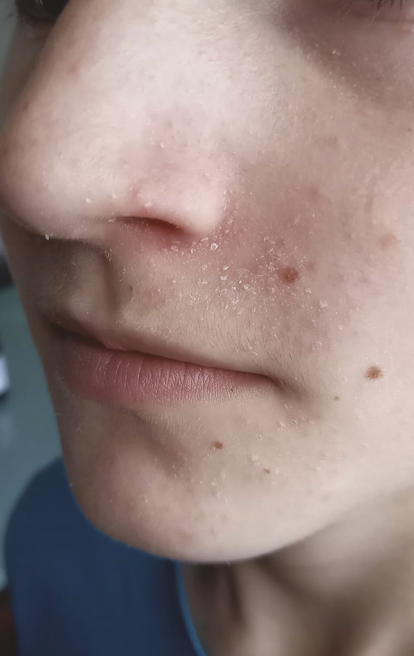Dermite séborrhéique avec présence de squames grasses, essentiellement sur la zone centro-faciale (ailes du nez).