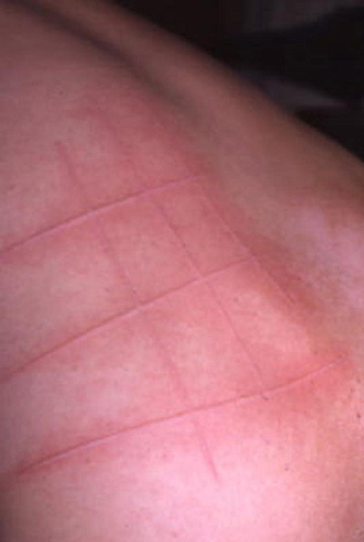 Le dermographisme est défini par des lésions linéaires et papuleuses apparaissant habituellement quelques minutes après un frottement ou une friction sur la peau, chez l’adulte jeune ou l’adolescent. Le dermographisme n’a aucune cause allergique et ne nécessite aucun bilan particulier.