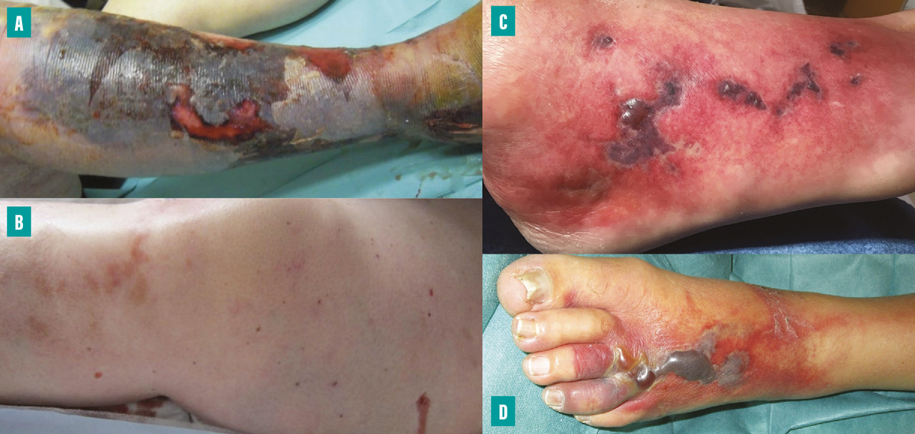(A) Larges zones de nécrose de la jambe.