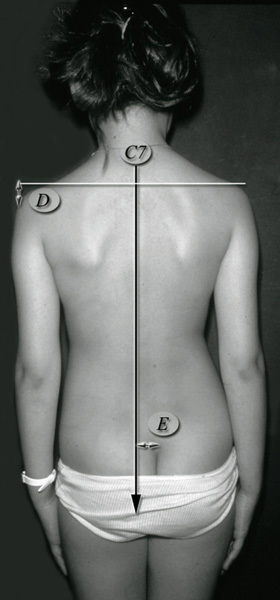 Le déséquilibre frontal du tronc est mesuré par la distance entre le fil à plomb à l’aplomb de l’épineuse de C7 et le sillon interfessier.