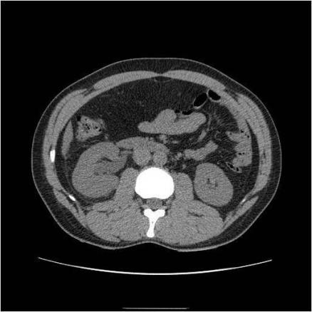 Scanner TDM sans injection à basse dose. Dilatation asymétrique des cavités pyélocalicielles rénales droites. Le scanner est maintenant utilisé de façon courante en urgence pour la prise en charge des patients avec une douleur du flanc. Cette stratégie s’est imposée par sa simplicité et sa rapidité, puisqu’elle remplace par un examen unique sans injection de produit de contraste les autres techniques (ASP, échographie et UIV) permettant une prise en charge rapide de ces patients