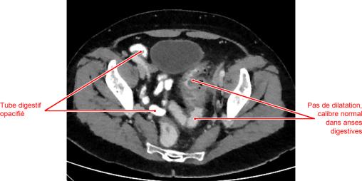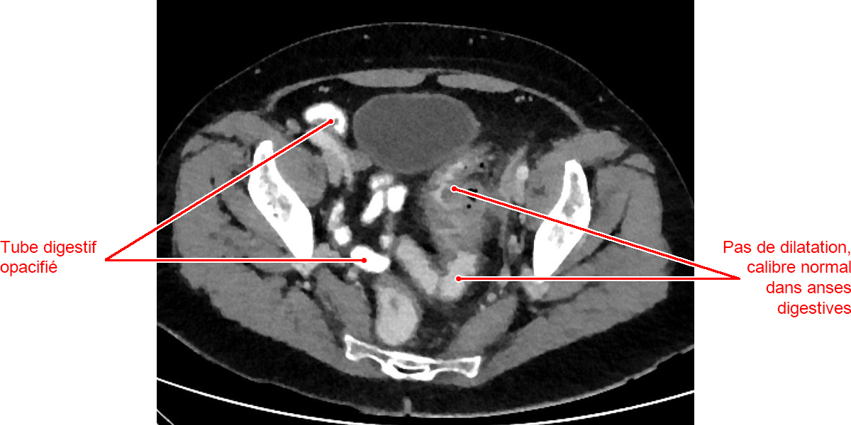 Hellerhoff, 7 novembre 2020. On note sur le scanner abdominopelvien la présence de plusieurs diverticules (petites bulles d’air au sein de la paroi colique) ; un épaississement de la paroi colique ; une infiltration de la graisse péridiverticulaire.