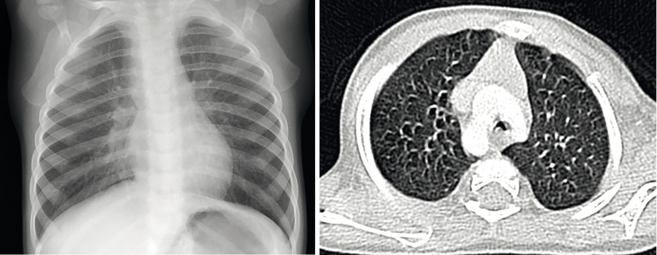 Radio du thorax et scanner thoracique revelant un double arc aortique compressif. Il s'agit d'une anomalie cardiaque fœtale responsable de compression trachéobronchique et/ou œsophagienne.