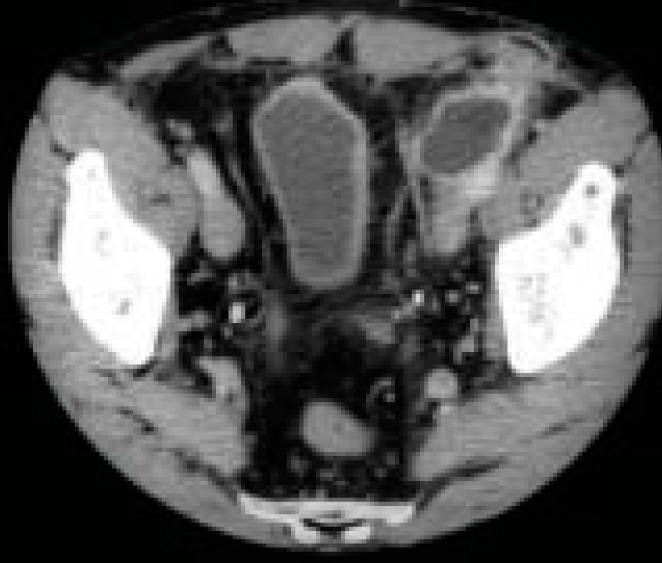 Tomodensitométrie abdominale. Douleurs inguinales après pose d'un plug. Mise en évidence d'un abcès au contact du plug. Voir : Rohr S, Steinmetz JP, Brigand C, Meyer C. Diagnostic et complications des hernies de l'aine. Rev Prat 2003;53(15):1645-50.